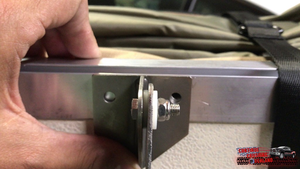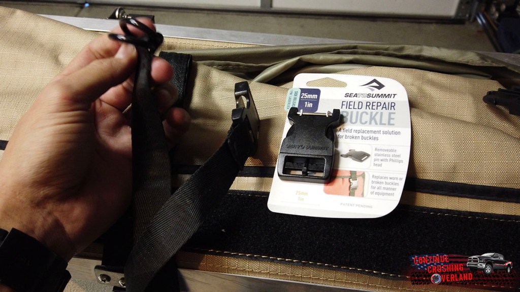 The next thing I replaced on the tent were the buckles for the cover and keeping the tent “together” when closed up. The Smittybilt D-rings that come with the tent to hold the cover on work okay, but when you tighten them down too tight it makes it very difficult to loosen when you get to your camping spot which is no fun trying to wrestle at night. I replaced them with Sea To Summit Field Repair Buckles on Amazon, and they were a direct fit. You do need to bend the old D-rings off of the straps, but you’ll make quick work of it with two pliers.