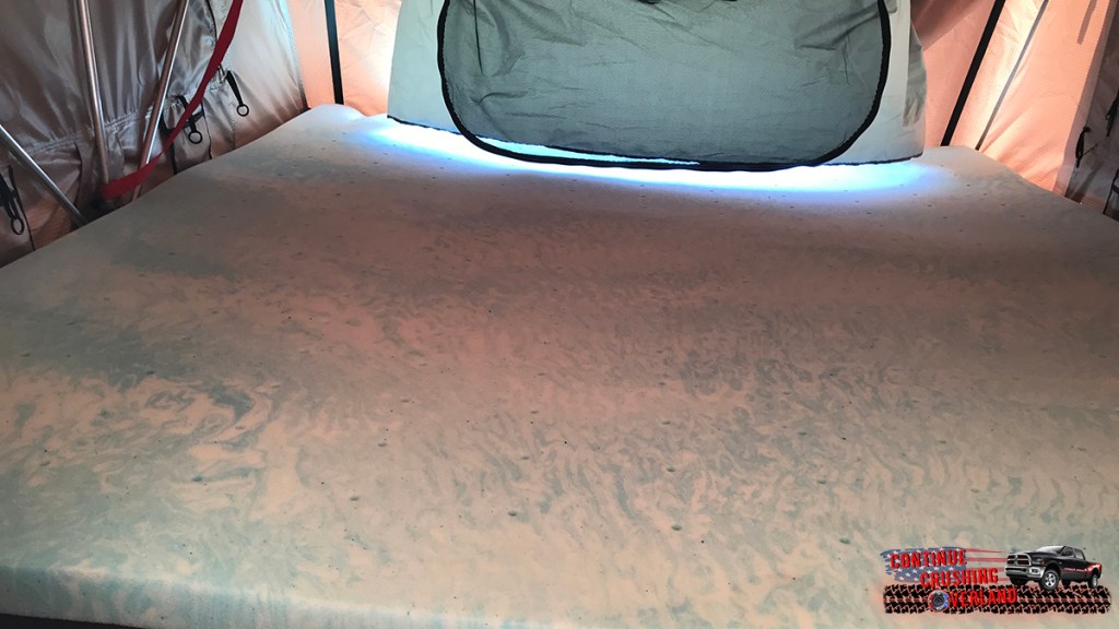 I also tried using a memory foam mattress in the tent, but it made the tent too difficult to close with the sleeping bags inside, so I usually did not use the pad unless my wife was camping with me. This is the exact one I used on amazon: Linenspa 2-Inch Gel Swirl memory Foam Topper-California King. If you don’t keep your bedding (sleeping bags, pillows, or comforters) you should be able to close up the tent with the factory pad and this memory foam one. Use caution while sleeping though, they become pretty hard when it’s cold out.